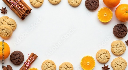 Cozy Winter Scene of Cookies, Cinnamon, and Oranges Frame White Space Flat Lay