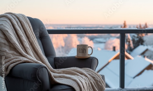 Cozy winter scene on a balcony. Creamy knitted blanket draped over a dark gray armchair, a coffee mug sits on the armrest, overlooking a snowy landscape at sunset