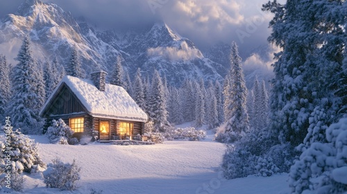 Cozy winter scene with a snow-covered cabin, pine trees, and a warm, glowing light inside