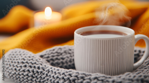 cosy, winter, scene, warm, cup, tea, hot drink, drink, steam, blanket, threaded, candle, yellow, grey, home, indoor, comfort, relaxation, evening, soft, texture, atmosphere, beverage, warmth, mug, hot, lifestyle, still, close, up, moment, calm, tranquil, cute, enjoy, rest, happiness, peaceful, tradition, joy, heartwarming, soothing, delight, inviting, setting