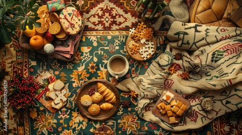 Cozy Winter Snack Scene on Decorative Rug