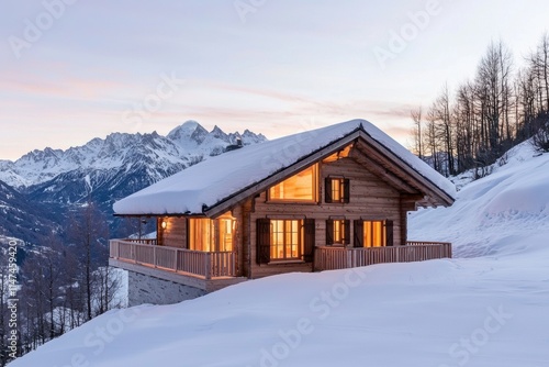 Cozy Wooden Cabin in Snowy Landscape with Majestic Mountains