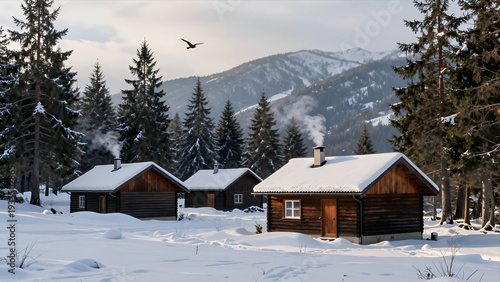 Cozy Wooden Cabins Nestled in Snowy Forest with Smoke Rising From Chimneys Mountains and Pine Trees under Winter Sky Peaceful Rural Retreat