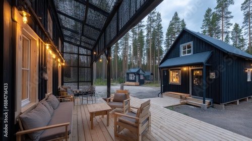shelter, cushion, accommodation, cabin, illumination, dwelling, exterior, warm, home, dark, space, wooden, building, deck, lounge, tree, rustic, traditional, nature, retreat, atmosphere, railing, furniture, string, light, patio, rural, vacation, lodging, serene, cosy, wood, quiet, seating, get-away, setting, evening, twilight, travel, hospitality, pine, modern, relaxation, countryside, porch, forest, architecture