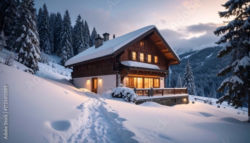 winter, snow, chalet, house, cabin, forest, tree, mountain, landscape, sunset, evening, dusk, light, warm, cosy, home, architecture, building, wooden, slope, hill, path, trail, sky, cloud, white, blue, orange, peaceful, quiet, serene, nature, cold, glacé, frost, fresh, alpine, idylli, secluded, retreat, vacation, holiday, travel, tour tourism, scenic, picturesque, wonderland, snowfall, countryside