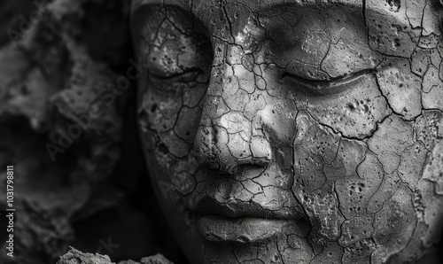 Cracked Buddha Face in Black and White: Peaceful and Meditative Close-Up Symbolizing Patience and Enlightenment in Buddhist Religion Concept