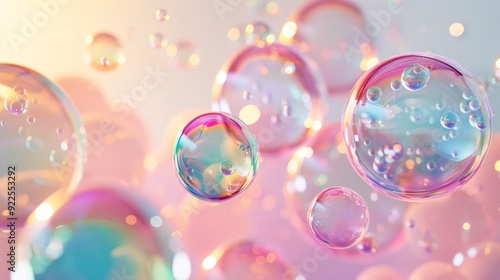 Craft a serene image of soap bubbles floating softly against a pastel-colored backdrop. Highlight the iridescent colors and reflections on each bubble, creating a tranquil and magical atmosphere.
