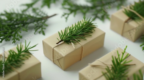 Craft gift boxes on a white background thuja branches Concept for Christmas holidays and DIY eco gifts Postcard layout Boxing Day : Generative AI