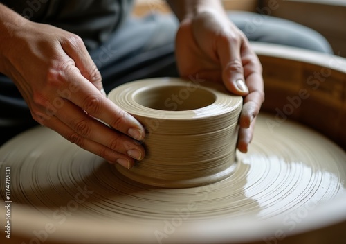 Crafting a clay pot on a pottery wheel in a serene workshop setting