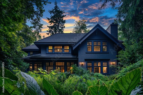 Craftsman home with navy windows and a dark grey roof, surrounded by lush greenery and blue sky, captured at sunset in a ratio