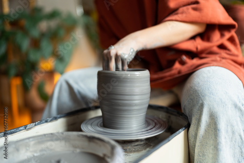 Craftswoman ceramist hands sculpt wet clay form final handmade product on pottery wheel for order. Involved person create unique tableware to relieve stress restore mental health on workshop after job