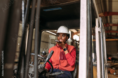 african, african american, mobile phone, mobile phone, communication, copy space, copy space, crane, driver, employee, factory, forklift, hard hat, hat, helmet, indoor, indoor, industrial, industry, machine, machinery, mobile phone, operator, phone, portrait, professional, safety-gear, service, sitting, smartphone, storehouse, talking, transportation, vehicle, voice, warehouse, woman, men at work, working, workplace, workshop