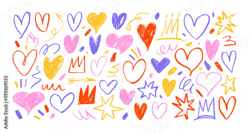 Crayon drawn colorful doodle hearts, crowns and squiggles in kid's style. Hand drawn funky romantic elements.