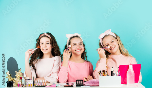 Cream base tone. Prevent acne. Kids makeup. Skin care concept. Cosmetics for children. Beauty and fashion. Happy girls doing makeup together. Sisterhood happiness. Cosmetics shop. Apply powder