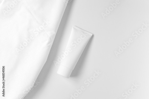 Cream Bottle Mockup. Cosmetic Bottle Mock Up on white background near white cotton textile. Fabric mockup. Blank White Glossy Tube