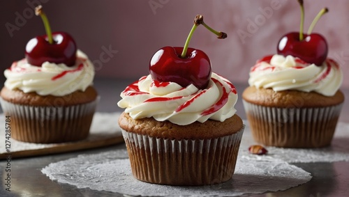 Cream cakes with cherries on a plate