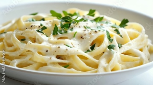 Creamy Alfredo fettuccine pasta topped with fresh herbs isolated