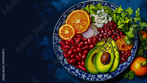 Creamy avocado, juicy tomatoes, crunchy lettuce, red beans, sweet pomegranate seeds, sour orange slices, fresh onion rings, fragrant coriander leaves in a refreshing salad bowl.