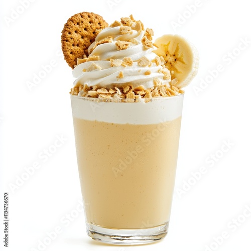 Creamy Banana Smoothie in Glass Topped with Whipped Cream and Cookies