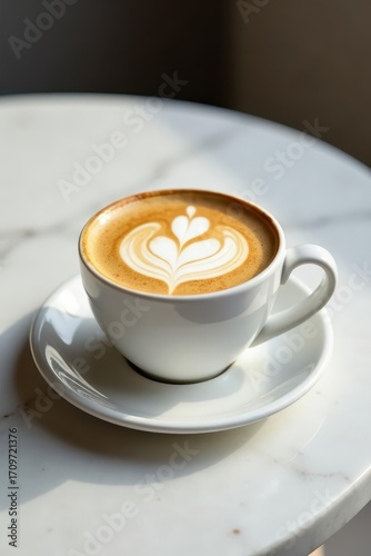 Creamy cappuccino in a ceramic cup sits on a pristine white marble table , still life, ceramic