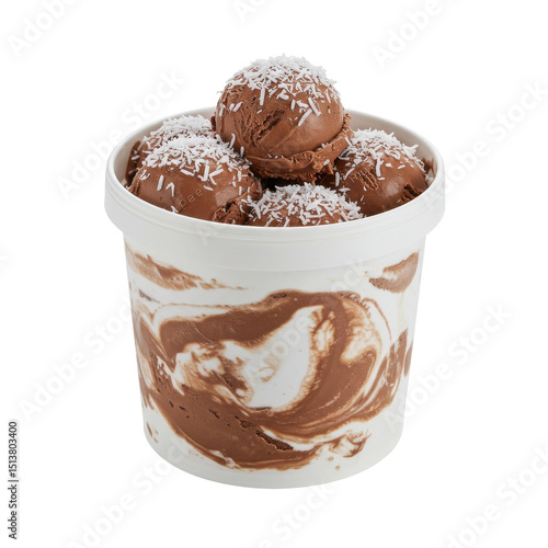 Creamy chocolate ice cream scoops topped with coconut flakes in a swirled container