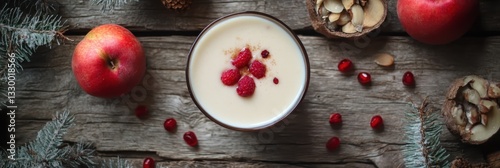 dessert, raspberry, cream, food, christmas, winter, holiday, sweet, delicious, culinary, rustic, wooden, table, bowl, berry, red, fruit, apple, pomegranate, nut, almond, cinnamon, cosy, festive, epicure, healthy, vegan, vegetarian, organic, natural, tasty, deliciously, treat, comfort, seasonal, photo, still life, overhead