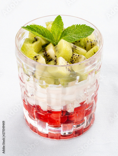 Creamy dessert with strawberry and kiwi on white background