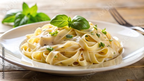 creamy, pasta, basil, garnish, low angle