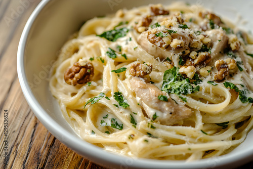 fettuccine, alfredo, pasta, chicken, walnut, cream, sauce, italian, dish, food, bowl, cookery, epicure, delicious, dinner, lunch, meal, parsley, herb, sprinkle, parmesan, cheese, plate, tasty, traditional, fresh, homemade, nourishment, receipe, eatery, rustic, wooden, table, surface, closeup, creamy, culinary, gastronomy, elegant, still, life, chopped