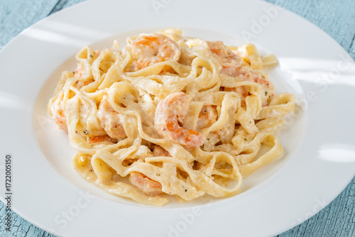 Creamy fettuccine shrimp pasta white plate savory sauce gourmet flavor