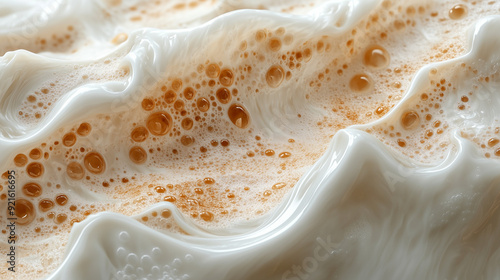 Creamy Latte Art: A close-up macro shot of frothy latte art, capturing the intricate swirls and bubbles of the creamy foam. This image evokes a sense of indulgence and sophistication, perfect for show