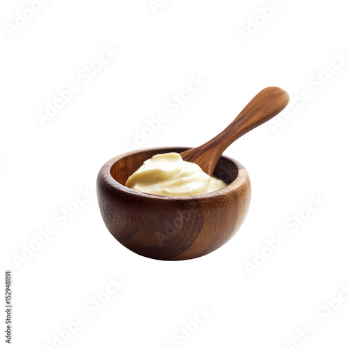 Creamy Mayonnaise in Wooden Bowl with Spoon