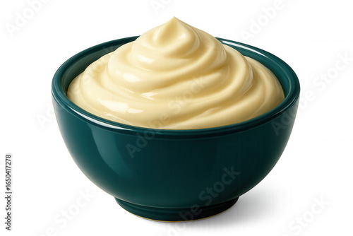 Creamy mayonnaise swirling in a green bowl, isolated on a transparent background, perfect for food and cooking projects