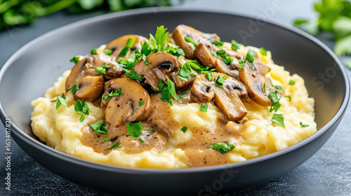 Creamy mushroom sauce over fluffy mashed potatoes garnished with fresh herbs creates delightful