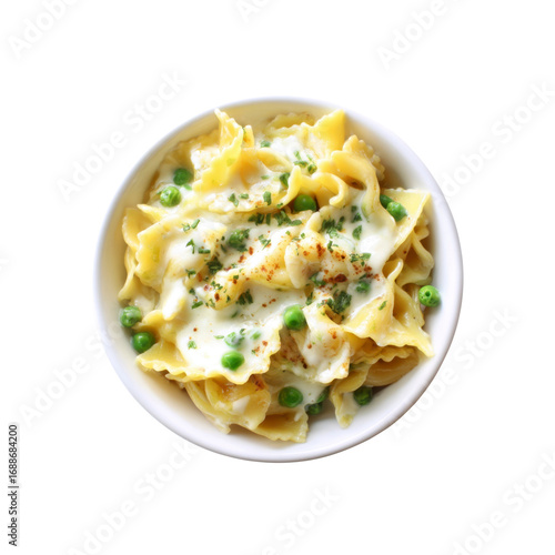 Creamy Parmesan Pasta with Peas in White Bowl - Overhead Shot