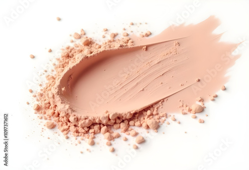 Creamy pink makeup spread on white surface with loose powder scattered around, showcasing smooth texture and natural tones