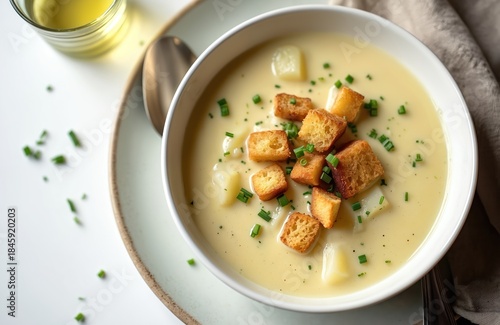 soup, potato, leek, creamy, crouton, chives, bowl, food, closeup, white, simple, elegant, warm, comforting, rustic, presentation, traditional, smooth, winter, hot, garnish, homemade, hearty, nourishing, delicious, light, cosy, flavorful, healthy, rich, filling, soup bowl, clean, alimentary, soft, meal, dish, dinner, vegetable, plate, lunch, gastronomy, cookery, receipe, kitchen, cooking, epicure