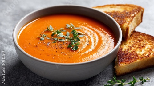 Creamy pumpkin soup with fresh herbs served in a bowl with toasted bread on a dark surface for healthy eating and cozy meal presentation