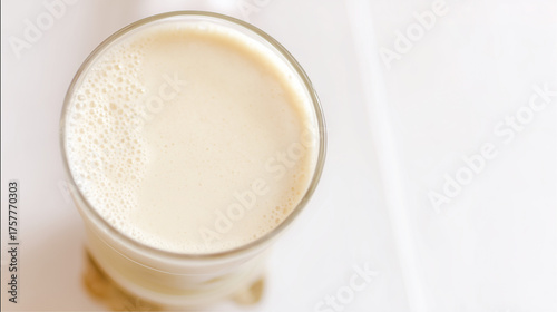 Creamy refreshment: A high-angle view captures a glass of frothy, creamy drink, offering a moment of pure refreshment, clean lines, and inviting textures.