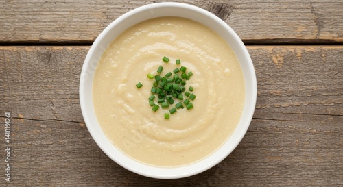 Creamy Soup Bowl Overhead Shot - Delicious creamy soup, garnished with fresh chives, served in a rustic bowl. Comfort food, healthy eating, simple recipe, wholesome ingredients, culinary delight