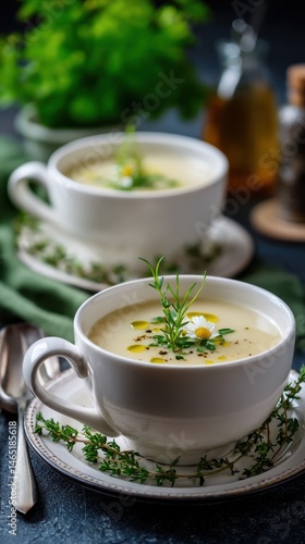 soup, creamy, bowl, cup, white, ceramic, healthy, food, cookery, lunch, dinner, garnish, herb, thyme, dill, chamomile, floral, rosemary, oil, olive, vegetarian, vegan, delicious, tasty, still life, plate, saucer, table, dark, background, eating, dieting, nourishment, culinary, cooking, fresh, homemade, presentation, epicure