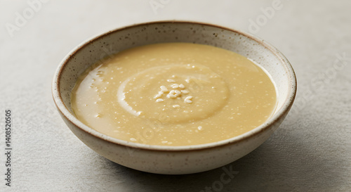 Creamy Tahini Sauce in Ceramic Bowl with Sesame Seeds Garnish