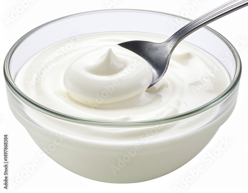 Creamy white yogurt is being swirled in a clear glass bowl with a metal spoon, for breakfast.