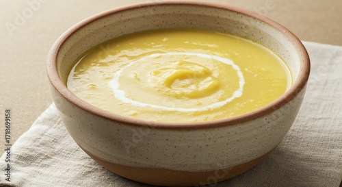 Creamy yellow soup in ceramic bowl