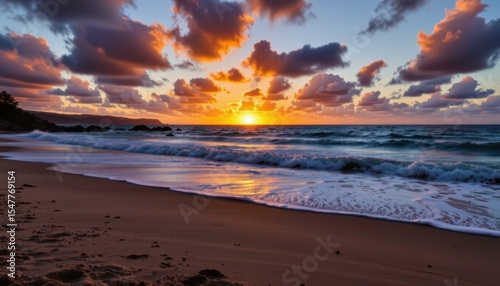 create a captivating nighttime seascape featuring a beautiful coastal landscape under the mesmerizing sunset on the beach