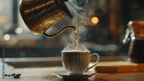 Create a close-up view of coffee pouring from a vintage brass carafe into a ceramic mug.