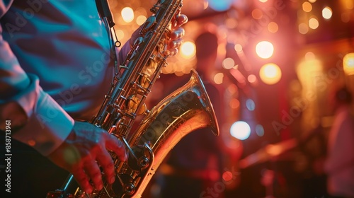 Create a lively scene of a jazz band performing on a dimly lit stage in a cozy club. Highlight the saxophonist's expressive solo as the audience is entranced by the soulful music.