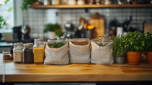 zero, waste, kitchen, sustainable, living, recyclable, container, herb, spice, grain, preparation, cooking, countertop, natural, light, greenery, jar, cosy, atmosphere, culinary, minimalist, organisation, art, clean, design, home, food, storage, wellness, environment, conservation, local, ingredient, healthy, lifestyle, aromatic, decor, pantry, creativity, simplicity