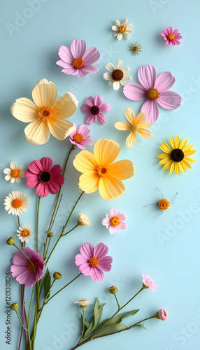 Creative abstract composition with various spring flowers on pastel blue background. Minimal fly or levitate natural concept with place for text, origami, with white tones