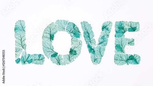 Creative arrangement of green leaves forming the word love on a white background showcasing nature's beauty and artistry